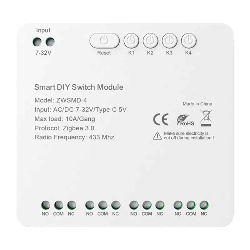 Az Avatto ZWSMMD-4-32V egy 4 csatornás ZigBee kapcsolómodul feszültségmentes érintkezővel, amelyet alacsony feszültségű eszközök biztonságos és pontos kezelésére terveztek, akár 32V DC feszültségig. Minden csatorna akár 10 A terhelést is támogat, ami nagy rugalmasságot biztosít a világítás, az otthoni automatizálás vagy a vezérlőrendszerek vezérlésében. A feszültségmentes érintkező használata ideálisvá teszi a modult ott, ahol a tápáramkör és a vezérlőjel szétválasztása szükséges.