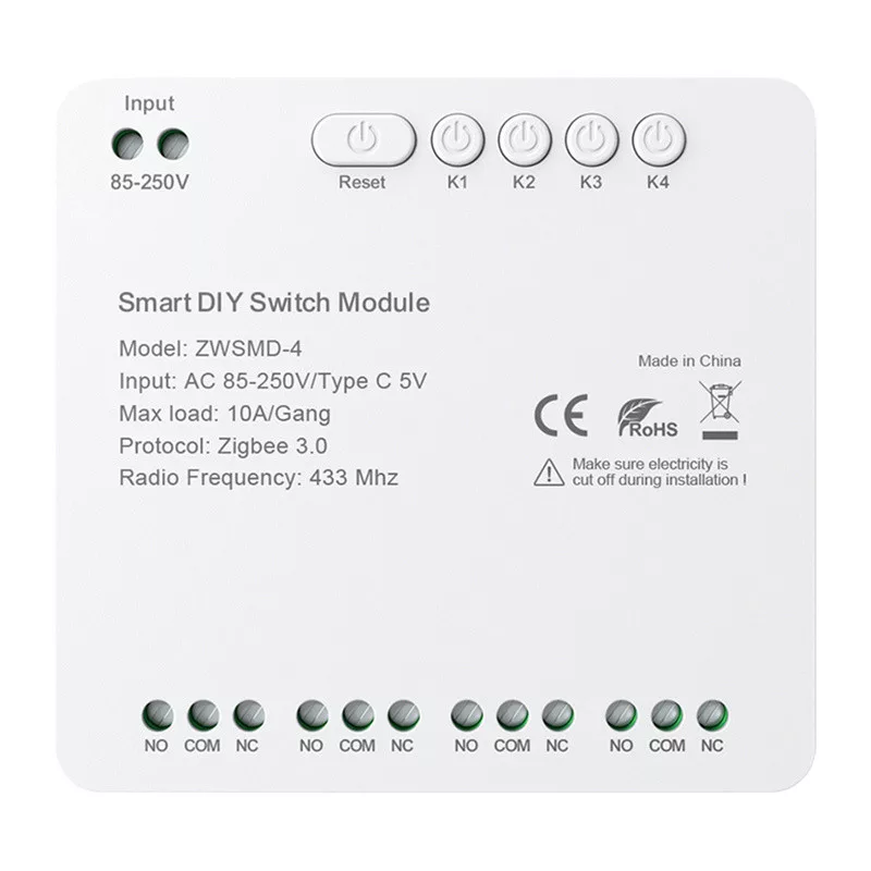 Az Avatto ZWSMMD-4-250V egy 4 csatornás ZigBee kapcsolómodul feszültségmentes érintkezővel, amelyet úgy terveztek, hogy biztonságosan és pontosan kezelje az eszközöket DC 250V-ig. Minden csatorna akár 10 A terhelést is támogat, ami nagy rugalmasságot biztosít a világítás, az otthoni automatizálás vagy a vezérlőrendszerek vezérlésében. A feszültségmentes érintkező használata ideálisvá teszi a modult ott, ahol a tápáramkör és a vezérlőjel szétválasztása szükséges.