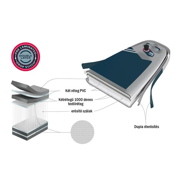 Egy komoly, belépő szintű deszka, mely alapanyagában (1000 denes drop stitch belső szövetszerkezet + MSL kétrétegű PVC külső borítás, duplafalú élerősítéssel, jó tapadást biztosító, krokodilbőr mintás, Gator EVA állófelülettel) a prémium termékekhez hasonló, de mégis elérhető áron. A szettek az olcsóbb piaci termékektől eltérően magas minőségű komponenseket tartalmaznak.