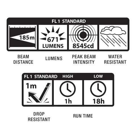 A nagyteljesítményű LED fényforrás ultrafényes világítást biztosít, így bármilyen környezetben tökéletes láthatóságot nyújt. A taktikai kialakítású, üvegtörő fej (Crowned Bezel) nemcsak markáns megjelenést ad, hanem közelharcos vagy vészhelyzeti helyzetekben is hasznos funkciót nyújt. A hátsó kapcsológombbal egyszerűen és gyorsan válthatsz üzemmódok között – a stresszhelyzetekre optimalizálva.