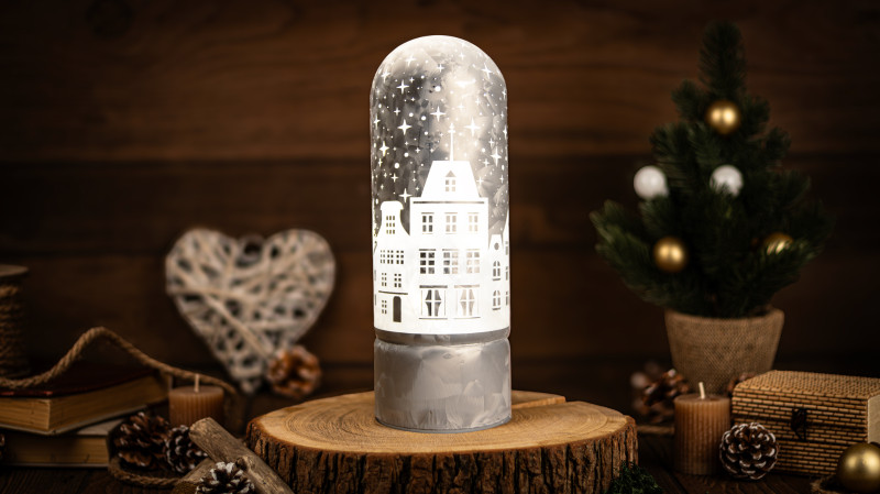 LED karácsonyi bura, város, üveg, elemes (X25007)